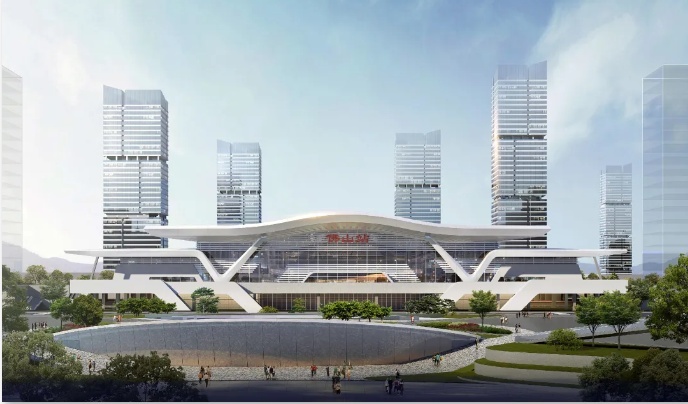 广湛高铁佛山站是在佛山中心城区佛山站原址附近新建的高铁站。佛山站设计理念为“锦绣湾区,花开禅城”。站房设计取意“白兰花开”,站房正立面屋面柔美舒展,犹如花瓣,饱满、浑圆,与侧面曲线轮廓一脉相承,展现出了高铁的时代感与速度感,简洁明快。正面立柱刚劲有力,韵律从正立面延伸到侧面,犹如珠江边跳动的音符。幕墙线条如同桥梁,联通世界。