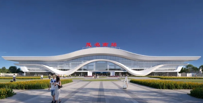 新兴南站位于云浮市新兴县。站房整体造型基于新兴当地岭南文化与广府文化的传统建筑形式,整体框架采用暖灰色铝板体现传统与现代相结合的建筑意向。天际线丰富的屋顶及有层次的檐口汲取了传统唐式大殿的脊线,既突出了建筑的层次感,又彰显站房的简洁大气。屋檐下的立柱与竖向金属格栅呼应当地传统建筑的立面意向。