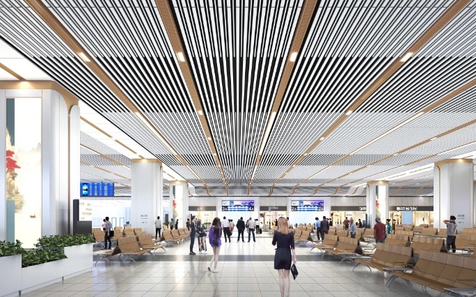 佛肇站位于佛山市与肇庆市交界。佛肇站作为广湛高铁与珠三角枢纽机场无缝衔接的核心节点,内装设计以“地下门户,岭南新韵”为核心理念,主色调提取佛山市花白玉兰的纯净白色,辅以雅棕金色点缀。空间设计强调“简洁中追求完美”,通过吊顶横向条带串联高低落差,在立柱区域疏密有致地形成节奏变化,优化空间视觉比例的同时提升导视效率。