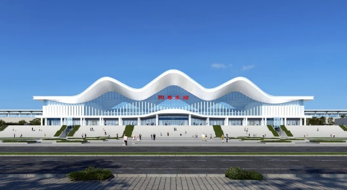 阳春东站位于阳江市阳春市。“漠水之阳,山岭叠翠”,漠阳江水与喀斯特地貌相互交织,站房建筑造型在这幅美景中自然勾勒而成。三拱屋面顺应山岭层叠,立面渐变的遮阳百叶嵌入玻璃墙面,虚实对比营造远山剪影与飞瀑直下共鸣的意境。